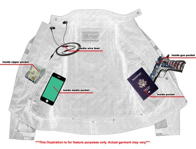 1 inside left-hand side concealed gun pockets made of special heavy-duty textile with built-in holsters and snap closure.
